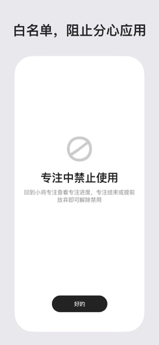 【阻止分心】支持设置应用白名单。专注期间,非学习类App统统禁用,让你全身心投入重要任务。