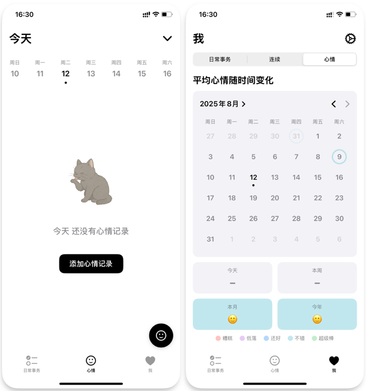 无论是每日喝水、运动等习惯打卡,还是阴晴不定的心情日记,都能轻松记录。更有按日、周、月、年分类的详细统计,让你清晰看到自己的成长轨迹和情绪变化规律~ 📈