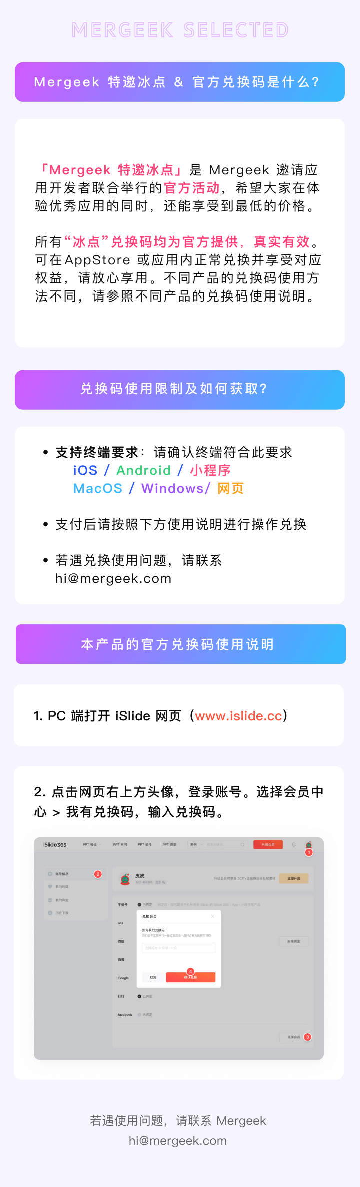 Mergeek 推荐:iSlide 是一款基于 PPT 的插件工具,包含 38 个设计辅助功能,8 大在线资源库,超 30 万专业 PPT 模板/素材,让 PPT 的设计简单起来,支持 Mac 和 Windows,大大降低制作专业 PPT 的门槛,不懂设计的也可以做出专业 PPT。