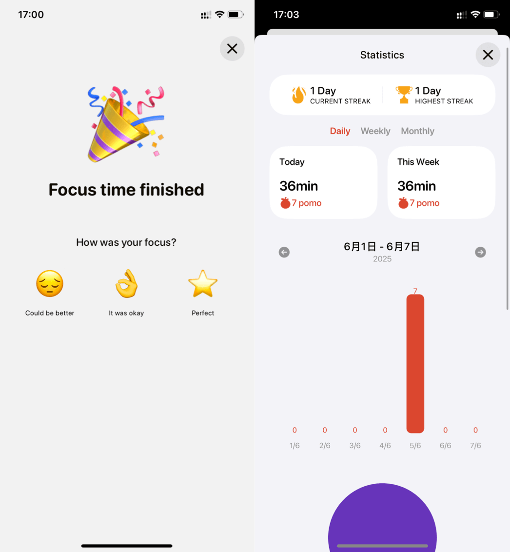 见证自己自律成长的时刻到啦!Pomofomo 会记录你连续遵守番茄钟计划的天数,每当看到天数不断增加,成就感爆棚🥳!这不仅是数字的累积,更是你养成高效习惯的见证。