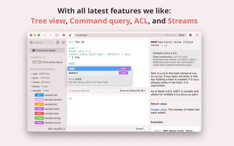 Medis 提供了一个查询视图来运行任意的命令。查询视图支持高亮关键字,并能实时显示相关帮助文档,不需要边 Google 边使用 Redis 了。