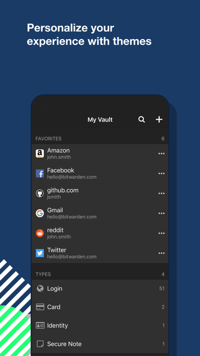 安全专家建议您为每一个账户使用不同的随机密码。但是要如何管理这些密码呢? bitwarden 可以让您轻松的创建、保存并访问您的密码。