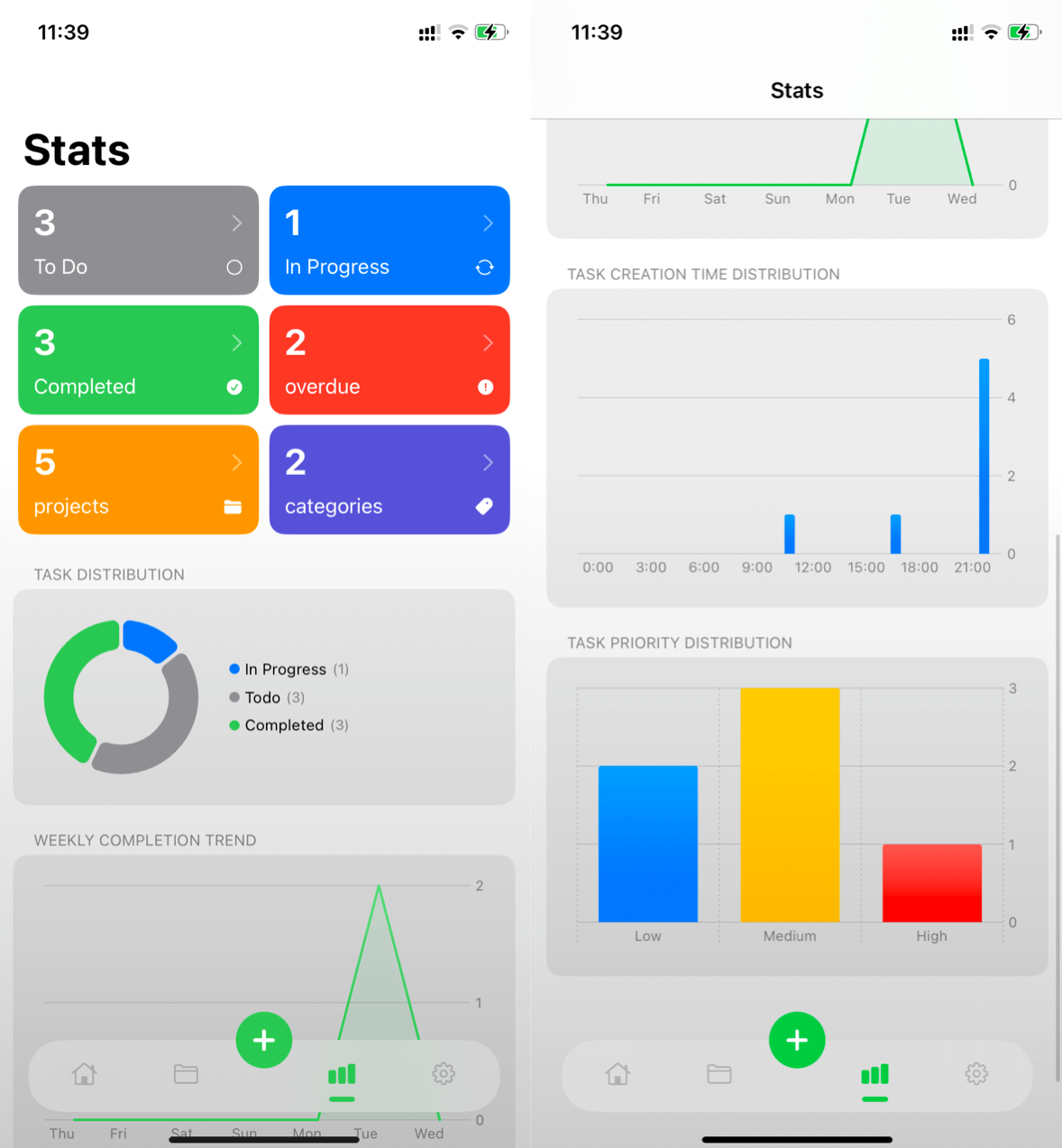APP 通过饼图、折线图和柱形图,直观展示任务的状态统计,包括待办、进行中、完成、超时等任务进度以及优先级占比,方便你全面掌握任务情况。