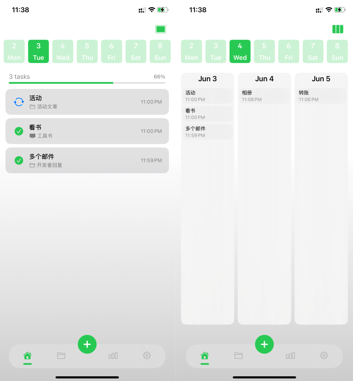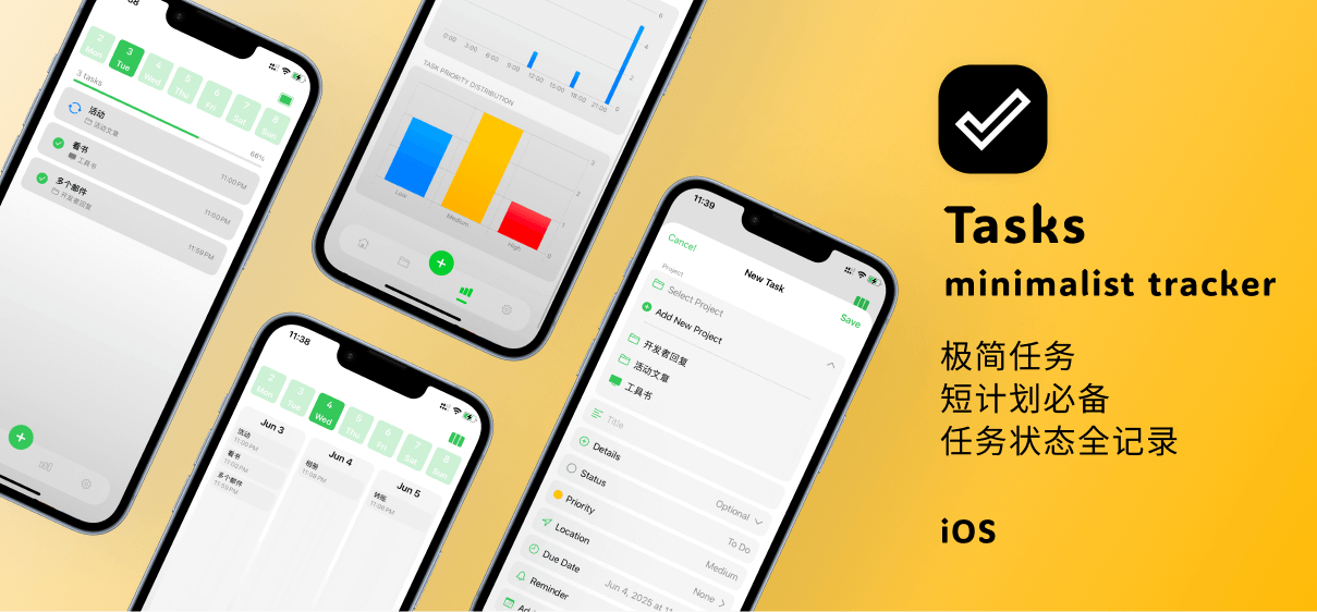 Tasks 是一款极简风格的任务跟踪工具。打开 APP,首页是一个横排日历,你可以在两种展示模式间自由切换:一种专注于当天的任务,让你心无旁骛;另一种则能展示当天及前后一天共三天的任务,方便你提前规划和回顾。📅