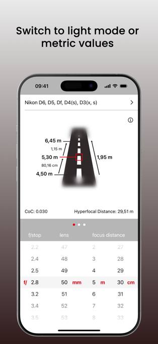 Simple DoF Calculator 使得摄影师和摄像师能够计算任何给定设置下的景深和超焦距距离。它计算近限、远限、总景深、超焦距距离、主体前方的距离以及主体后方的距离。只需选择您的相机、光圈、焦距和聚焦距离,它就会显示景深,所有计算均在实时完成。光圈范围:f/0.95 - f/64,焦距范围:3毫米 - 1200毫米,聚焦距离范围:1英寸 - 999英尺。支持以下相机: