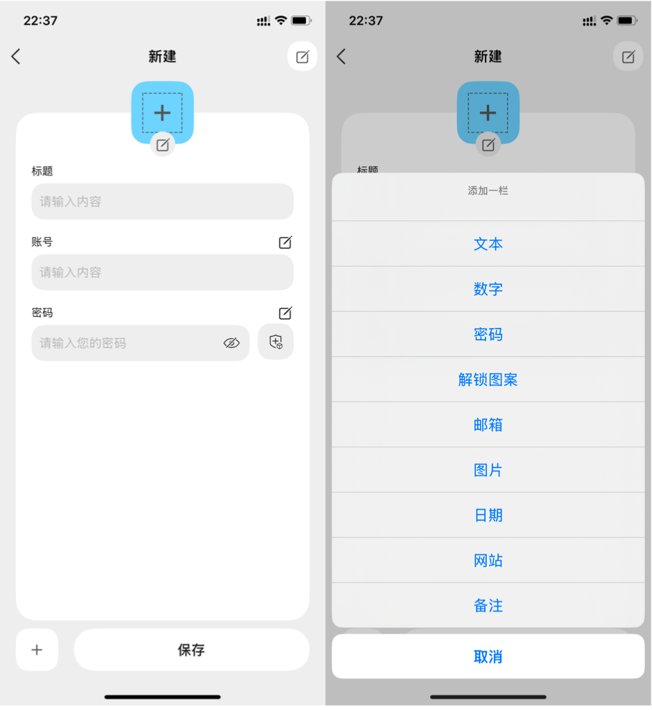 APP 可以记录与密码相关的任何数据,当然也是可以不是,它里面所有内容元素都可以自定义,任意添加一栏,可以是文本、数字、密码、解密图案、图片等等,如果没有合适的,自己编辑即可。十分有趣的是,它提供了图标搜索,网络提供的图标任君选择,游戏的图标、常用 APP 图标、网站图标,应有尽有,如果没有,自己上传也可以。