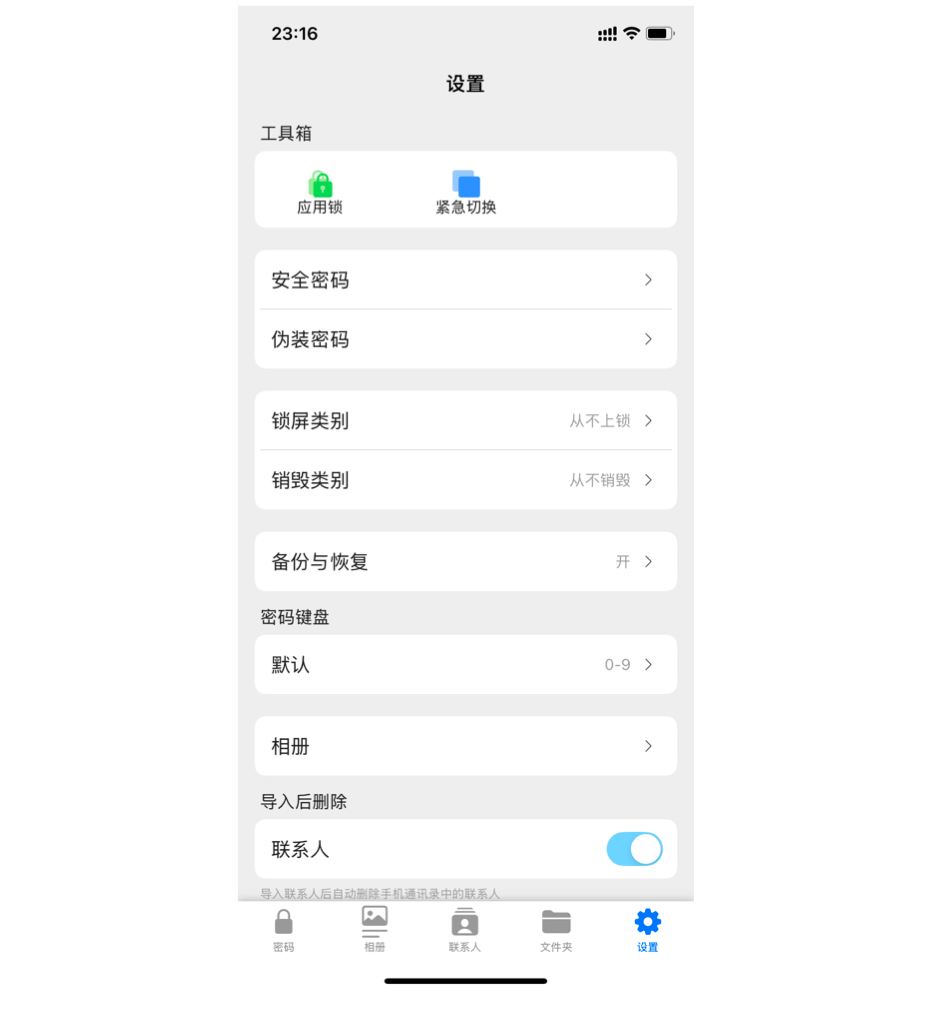 想要进入 APP,首先得输入正确密码,密码当然可以是常见密码、图案、Face ID。APP 还可以设置如果解锁多少次,没有进入时,会主动销毁保存的内容(看来确实是隐私级别很高的内容)